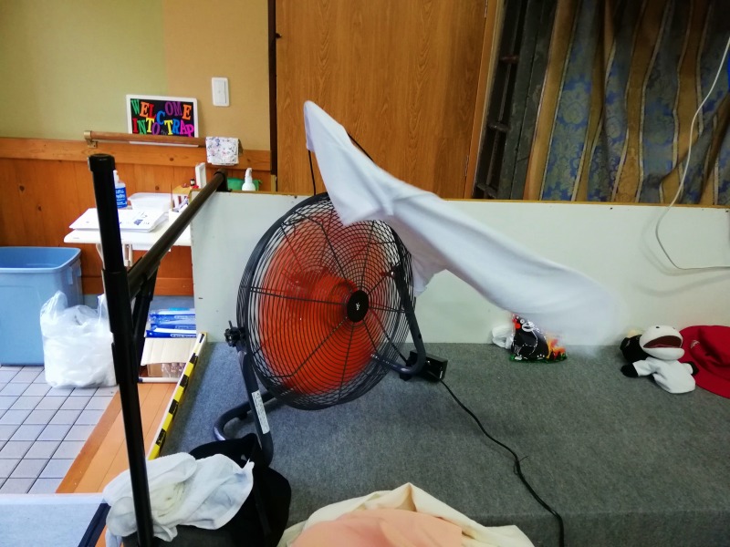 舞台下手から上手に向けて、工業用扇風機を設置してシーン毎に回したり、