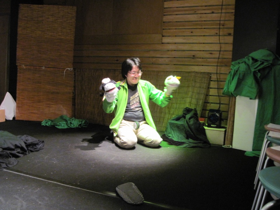 稽古場で「さんまいのおふだ」の絵本を2冊並べて学習。