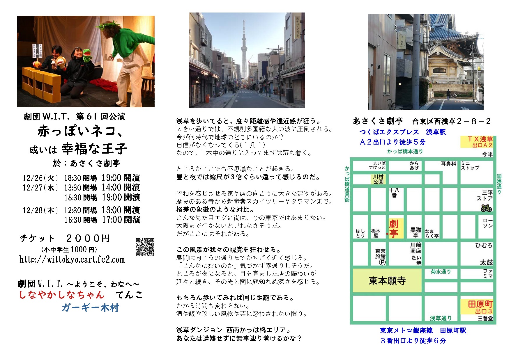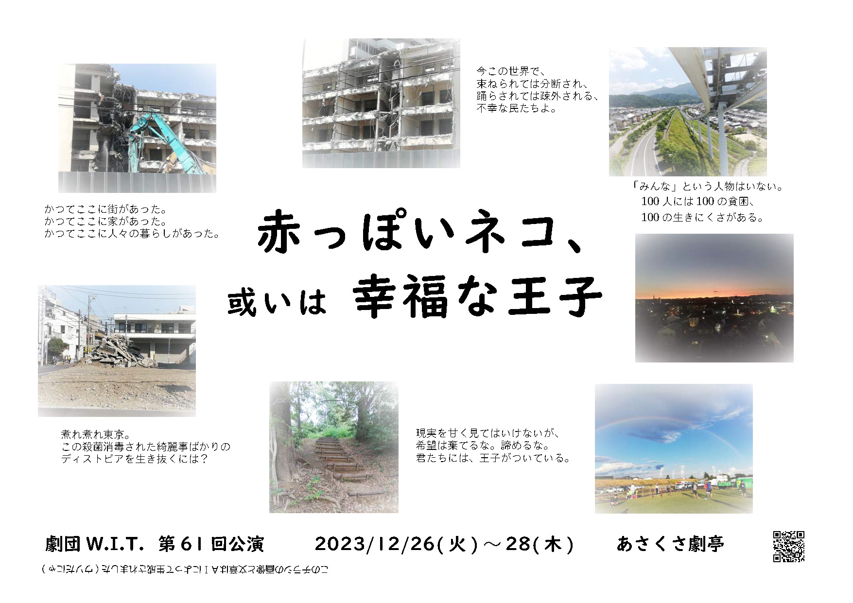 うぃっと第61回公演うぃっと第61回公演「赤っぽいネコ、或いは幸福な王子」12/26~28あさくさ劇亭にて。来てね! …劇団W.I.T.のメルマガです。基本、斜め上なブラックジョーク満載の文面なので、真に受けて炎上させないでね。